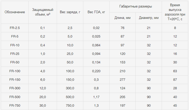 Автономные установки пожаротушения на базе генераторов огнетушащего аэрозоля (ГОА) серии FR (ФР): FR-2.5, -5, -10, -25, -50, -100, -150, -300, -500, -750 предназначены для тушения пожаров классов А2, В, С и Е (электрооборудование под напряжением до 38 КВ). Установки не предназначены для тушения металлов и веществ, горение которых происходит без доступа воздуха или сопровождается тлением.